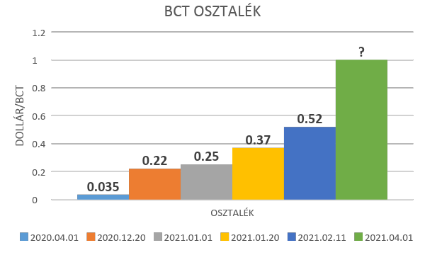A tavaly áprilisi osztalék fizetéskor volt 0,035 Usa Dollár/BCT. 2021. január 6-i adatok alapján már 0,49 Dollárnál tart. Az osztalékfizetésig, április 1-11-ig pedig még van idő. Vajon akkor mit mutatnak majd a számok?